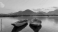 Fototapeta Two wooden boats float on a calm lake with mountain ranges and a colorful sky in the background.