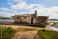 Fototapeta Side profile of shipwreck resting on sandy beach