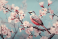 Fototapeta A Delicate Bird Perched on a Branch of Cherry Blossoms in a Soft Blue Sky