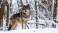 Fototapeta Solitary Majesty: An exquisite wolf, its fur blending with the snowy wilderness, stands poised in a tranquil winter landscape, radiating strength and serenity.