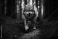Fototapeta Angry lone wolf walking alone in a forest path, showing teeth, front face ready to attack