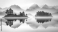 Fototapeta peaceful breathing space at dawn reflecting mountains and pine trees glassy water gentle fog calm and quiet serenity