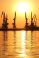 >Tapety koła>Style>Industrialny i Loft>Seaport at sunset, cranes in the port on the horizon, orange sky against the sea horizon, landscape with high-rise cranes, construction of a breakwater in the sea