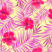 Fototapeta Vector tropical pattern with hibiscus flowers and exotic palm leaves. Trendy summer background. Summer floral illustration.