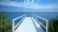 >Tapety koła>Tematy>3D z efektem głębi>A scenic white wooden pier overlooking a tranquil blue ocean under a bright sky with scattered clouds, surrounded by lush greenery along the coast.