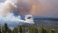 Fototapeta Firefighting helicopter drops water on flames in a forest under a smoky sky