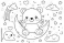 >Tapety koła>Tematy>Zwierzęta>Koty>Black and white line art of a cute cartoon bear sitting on the moon, surrounded by clouds, stars, and hearts in a night sky. Adorable kids coloring page or bedtime theme art.