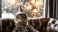 >Tapety koła>Tematy>Zwierzęta>Koty>Adorable festive cat wearing party hat, holding glass of champagne at New Year’s Eve celebration, glowing fireworks night sky background, joyful holiday digital illustration in modern 3D style artwork