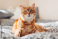 Fototapeta Ginger cat relaxing on couch in living room lying in funny pose on blanket. Pet enjoying sun at home