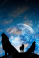 >Tapety koła>Tematy>Zwierzęta>Wilki>pack of wolves - three wolves silhouette, one howling wolf, over universe and Moon and stars in blue color like magic fantasy animals concept