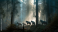 Fototapeta Illustration of a pack of wolves in a misty forest in the morning. Generative AI.