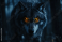 >Tapety koła>Tematy>Zwierzęta>Wilki>A close-up of a wolf with piercing orange eyes glowing in the dark, surrounded by the shadows of a dense forest, capturing the wild and mysterious nature of the wolf.